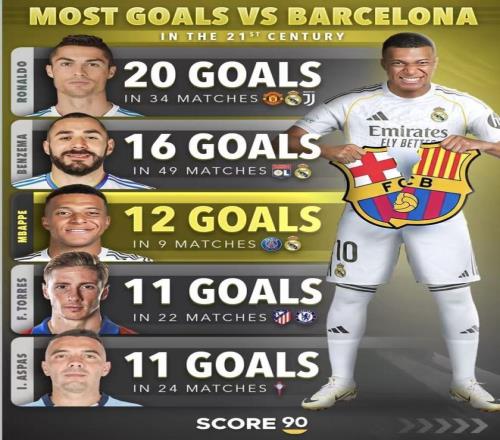 21世纪对巴萨进球最多球员!姆巴佩场均1.33球巴萨最大的苦主