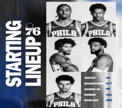首发阵容方面,76人队这边,保罗·乔治因左膝伤病管理缺战,排出的最新首发五人组为:乌布雷、巴洛、马克西、恩比德、VJ-埃奇库姆;步行者队这边,马瑟林拇指受伤、奥比·托平脚部受伤均无法出场,首发阵容则为:内姆布哈德、内史密斯、弗菲、西亚卡姆、杰-胡夫。
